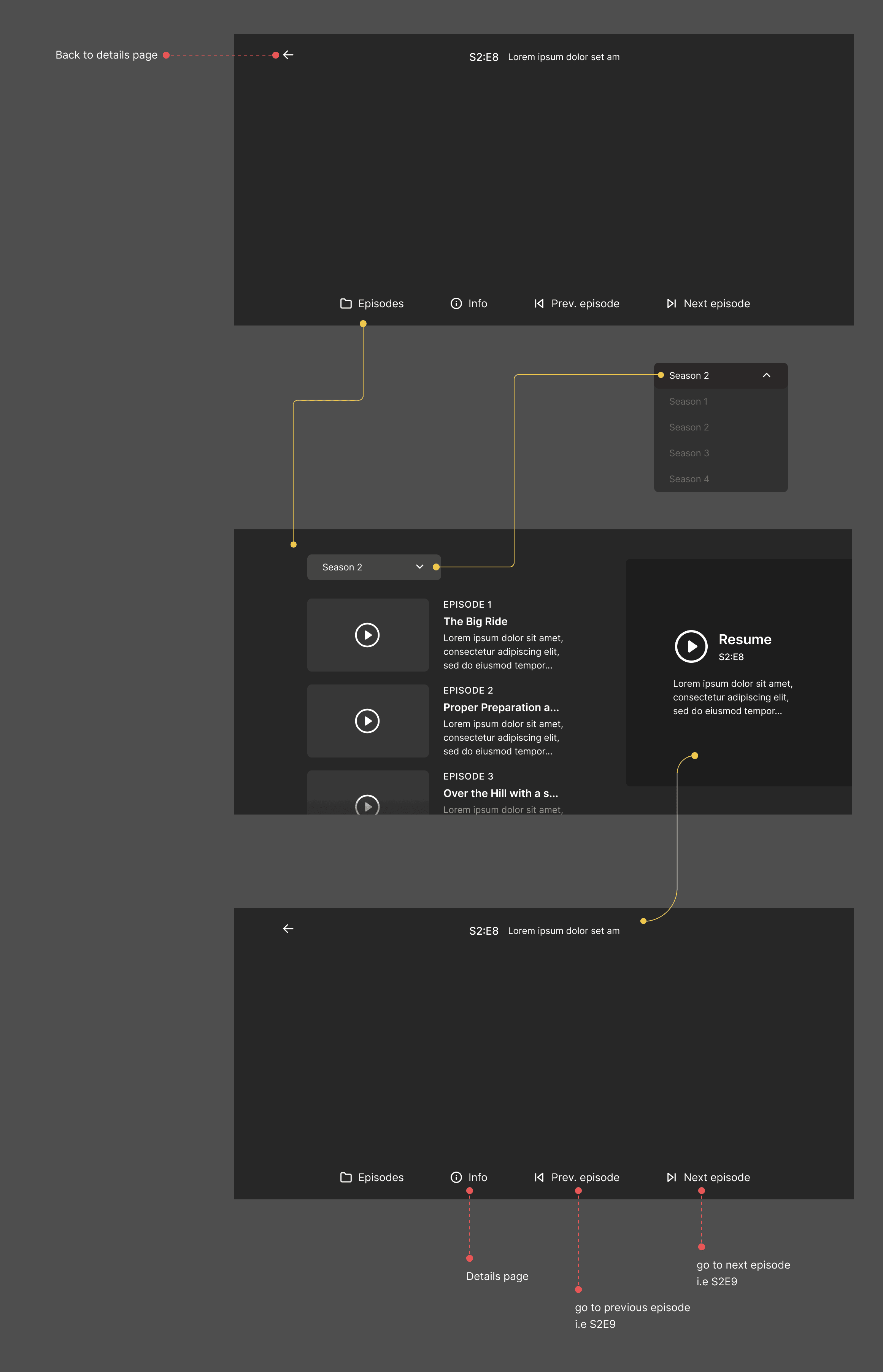 To validate the interaction model before visual design, I created a low-fidelity wireframe focusing only on navigation hierarchy, episode continuity, and control placement.